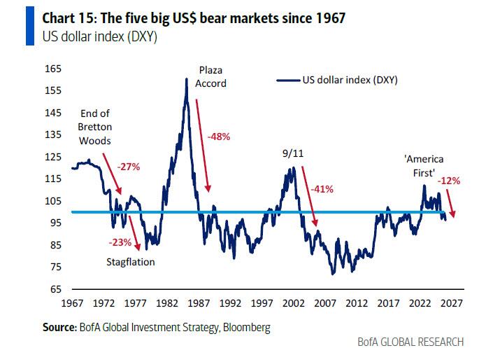 尽管周五美元汇率出现了反弹,但Hartnett指出,自特朗普就职以来,美元实际上已经下跌了12%。这种疲软并非偶然,而是一种政策导向。弱势美元被视为提振宾夕法尼亚、密歇根和威斯康星等“铁锈地带”摇摆州制造业的关键手段。