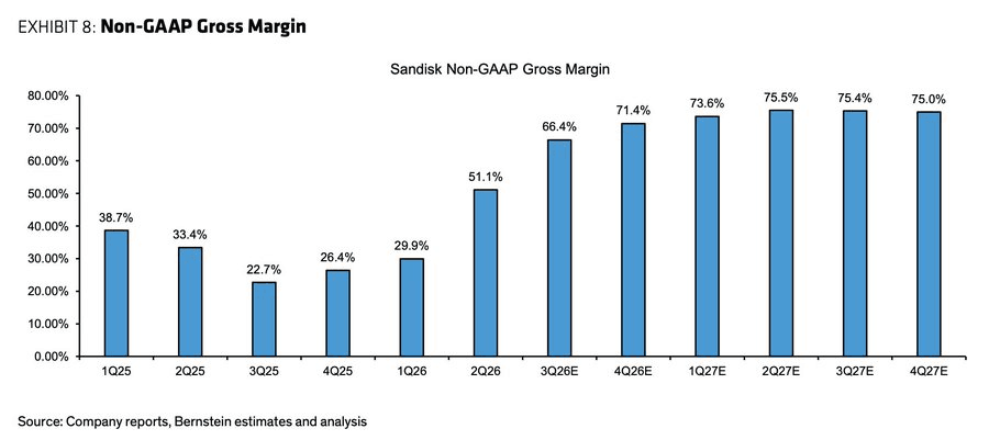 伯恩斯坦将闪迪目标价暴涨至1000美元,较当前股价仍有85%上涨空间,估值却仅为11倍2027财年PE。关键看点在于公司毛利率的爆发式扩张——二季度Non-GAAP毛利率已达52.1%,远超市场预期的...