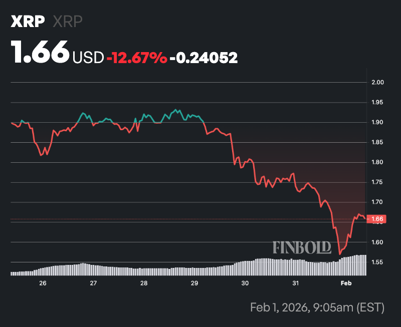 截至发稿时,XRP交易价格为1.66美元,过去24小时内下跌超过4%。从周线来看,该资产已下跌超过12.5%。