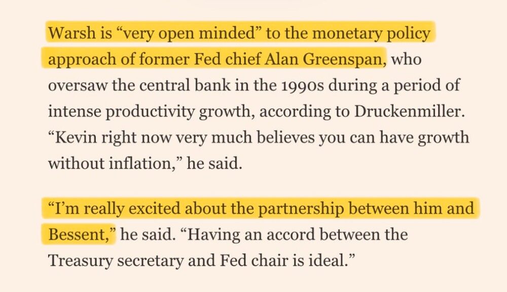 上图为“投资大神”Stanley Druckenmiller 对 Warsh 货币政策理念和其上任美联储主席后与贝森特达成一致的内容