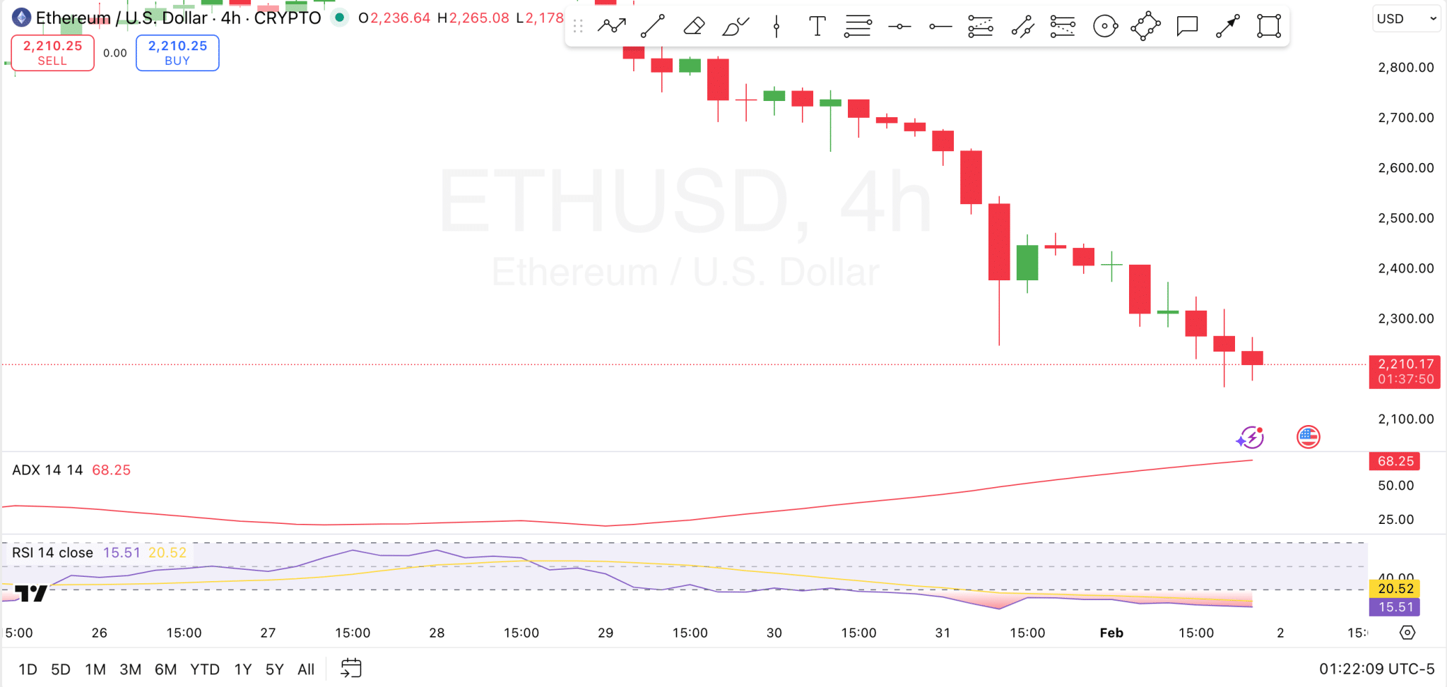 以太坊的价格走势4 小时图显示,以太坊价格持续承压,在经历一轮大幅抛售后,目前在 2200 美元上方盘整。该区域构成直接支撑。若跌破该水平,以太坊可能进一步走弱,下探至 2100 美元附近的下一个心理支撑位,届时买家可能会尝试短期防御。