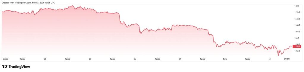 短短一周内,总数加密货币市场根据 Finbold 计算的数据,截至 2026 年 2 月 2 日发稿时,全球市值缩水约 4000 亿美元,从约 2.95 万亿美元降至约 2.56 万亿美元。
