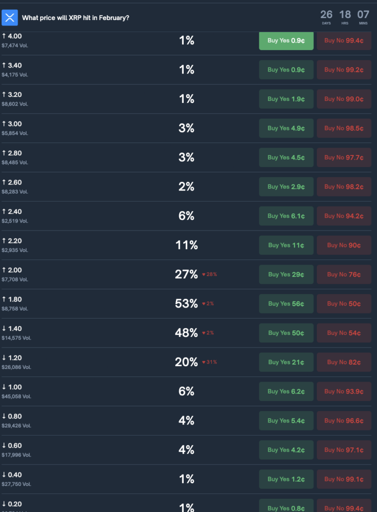 随着价格XRP持续面临波动,c加密货币预测市场表明,到 2 月底,该代币的价格可能仍将低于关键的 2 美元水平。