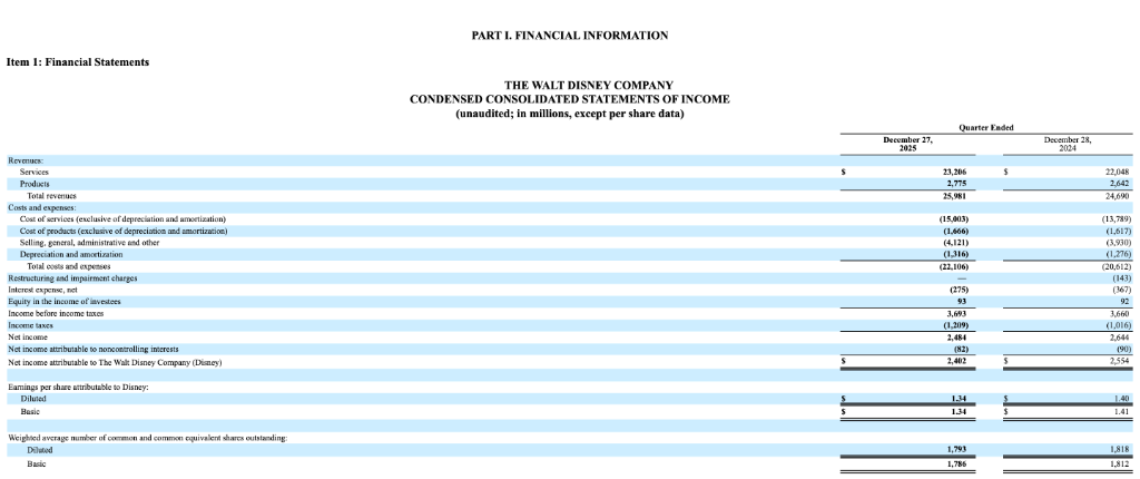 2月2日,迪士尼公布的2026财年一季度财报显示,公司营收实现5%的同比增长,达到259.8亿美元,归母净利润则同比下降6%至24.0亿美元,摊薄后每股收益为1.34美元,同比下滑4%。利润端主要受到娱乐内容成本上升、体育版权费用增加及一次性税务调整等因素的拖累。