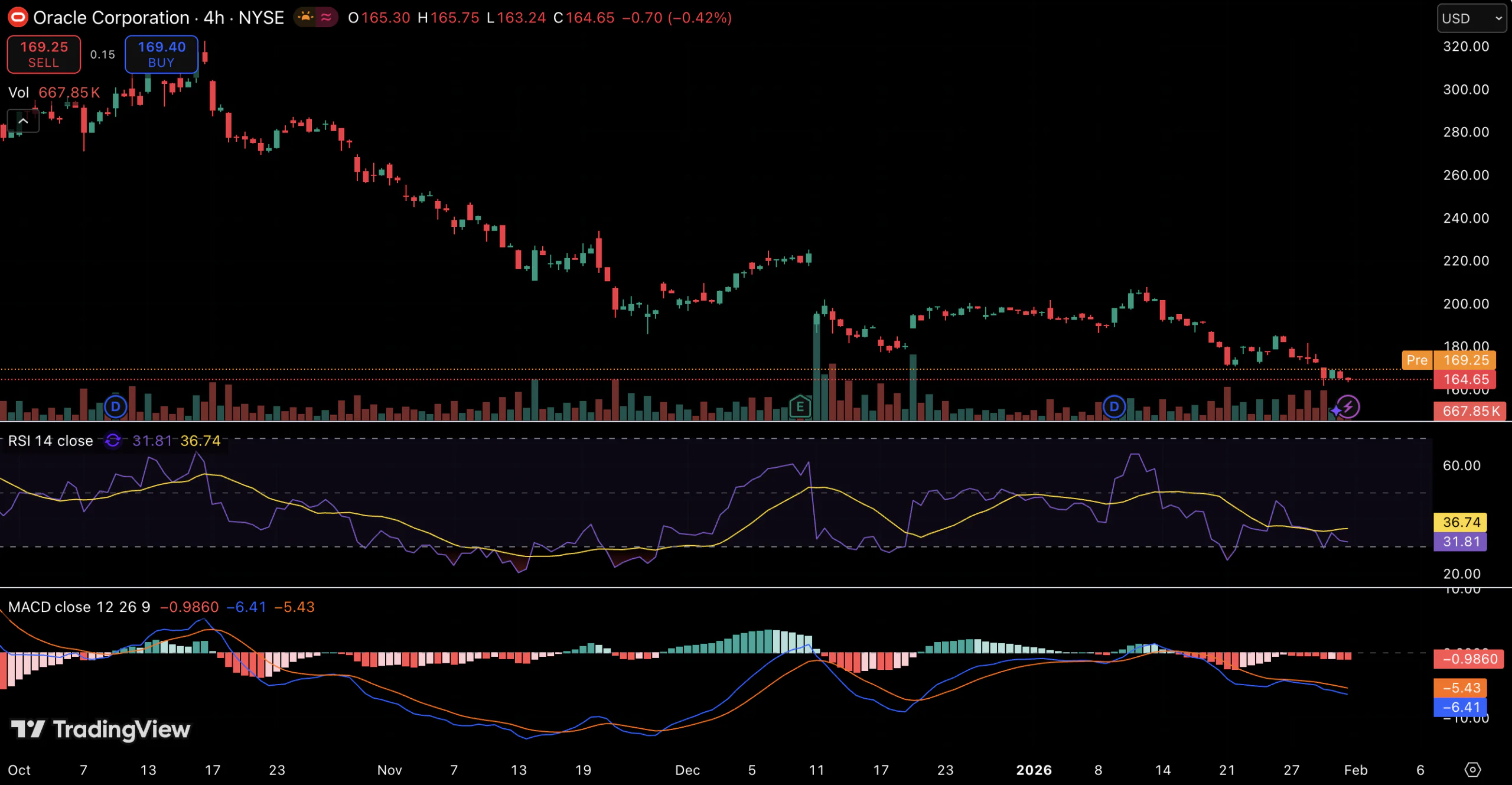 “>MACDMACD 指标依然保持强劲的负值,该指标线位于信号线下方,柱状图也仍显示红色柱状图。这种形态表明,即使抛售速度有所放缓,空头动能仍然占据主导地位。短期内,甲骨文股价可能会尝试短暂企稳或反弹。然而,如果没有明显的动能转变——例如相对强弱指数(RSI)重回40至50区间,移动平均收敛/发散指标(MACD)趋于平缓或走高——反弹很可能面临抛售压力。