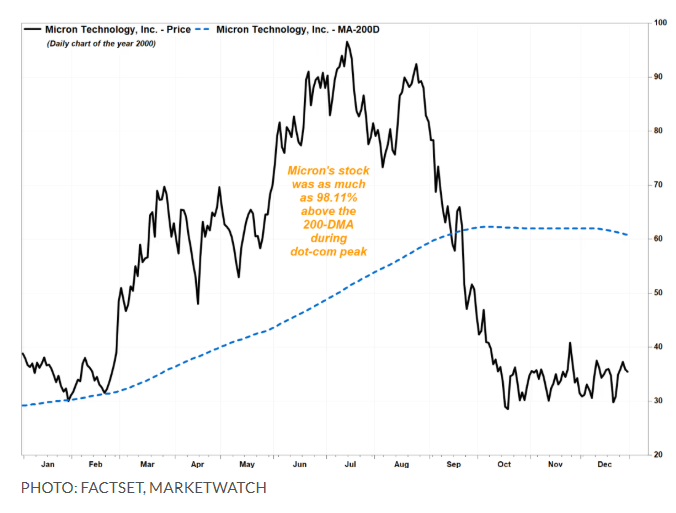 相比之下,2000年初互联网泡沫顶峰时期,这一偏离度最高仅达98%。当美光股价在2000年7月14日见顶时,偏离度为89%。此后三个月内股价暴跌65%,12个月后仍下跌62%。
