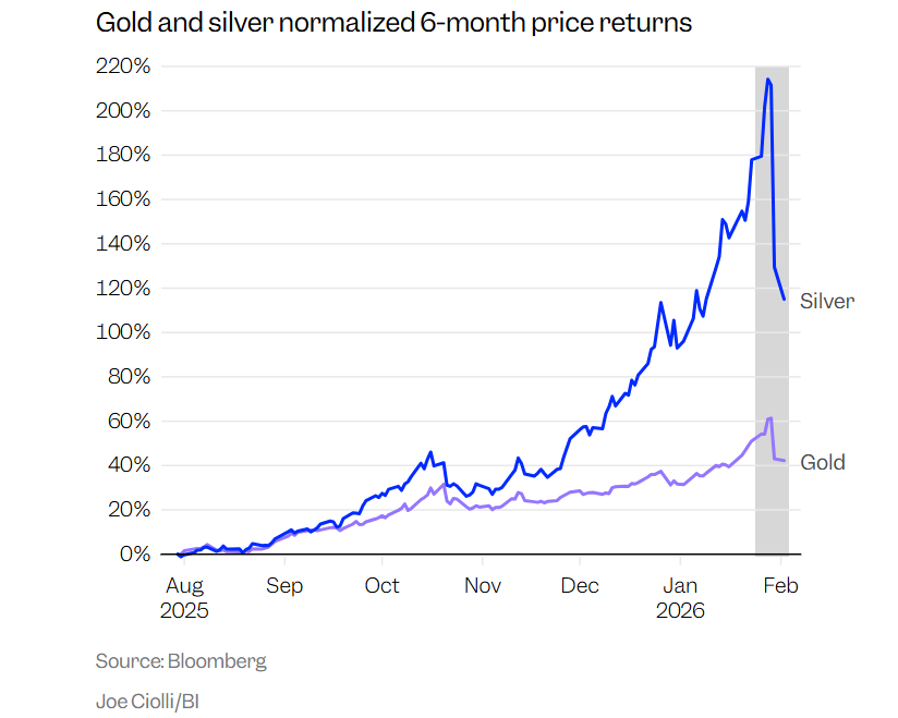 在沃什的提名促使市场重新评估所谓的“货币贬值交易”后,黄金和白银应声下挫。这一交易是过去12个月推动黄金创下历史新高的主要力量。