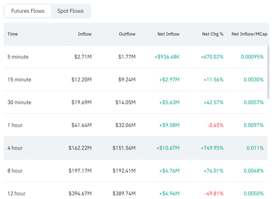 然而,随着 XRP 从 1.52 美元的低点反弹,目前交易价格已回升。高于 $1.6等级市场兴趣可能正在复苏,因为期货交易量在多个时间段内均呈现快速增长,其中过去一段时间的增幅高达749%。4小时。