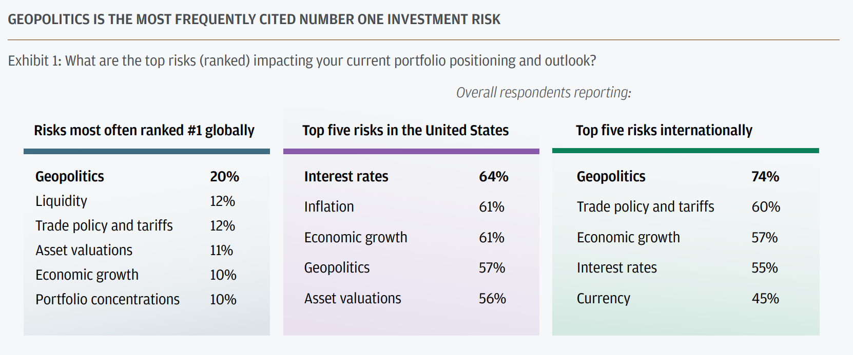 影响家族办公室投资组合策略的主要风险。来源:摩根大通