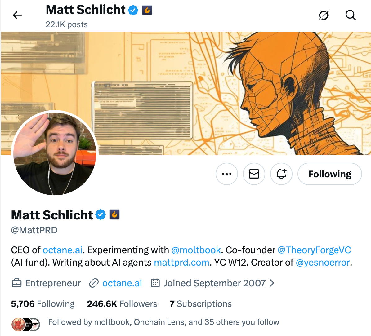 他是一位 AI 创业者、Octane AI 的 CEO,同时也是 YC W12 校友。长期以来,他沉迷于构建和使用自主 AI 代理,尤其钟情于开源框架 OpenClaw。OpenClaw 的前身,是你可能已经听说过的 Clawdbot,也是又一个刷爆科技圈和加密圈的名字。