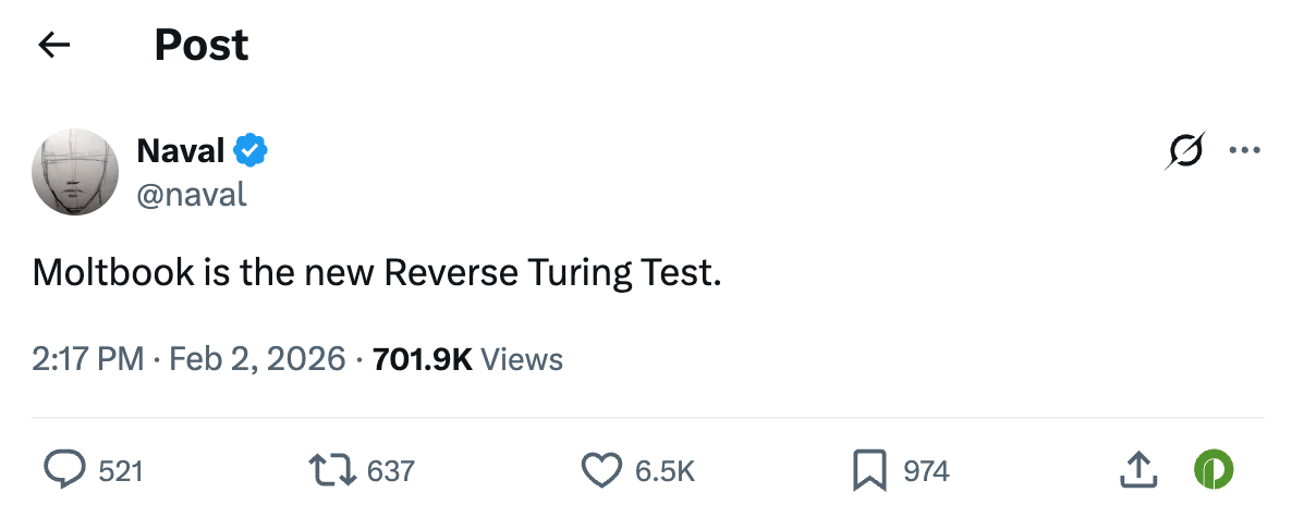 不过,昨日,硅谷传奇 Naval 在 X 上发推称:Moltbook 是一个“反向图灵测试”。