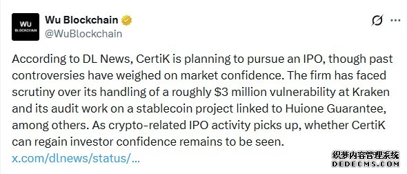 CertiK IPO上市:Web3安全公司进军华尔街 据DL平台最初报道,CertiK的IPO计划正在逐步成形,该公司正准备进行首次公开募股(IPO),这可能标志着Web3安全行业的一个历史性时刻。该公司计...